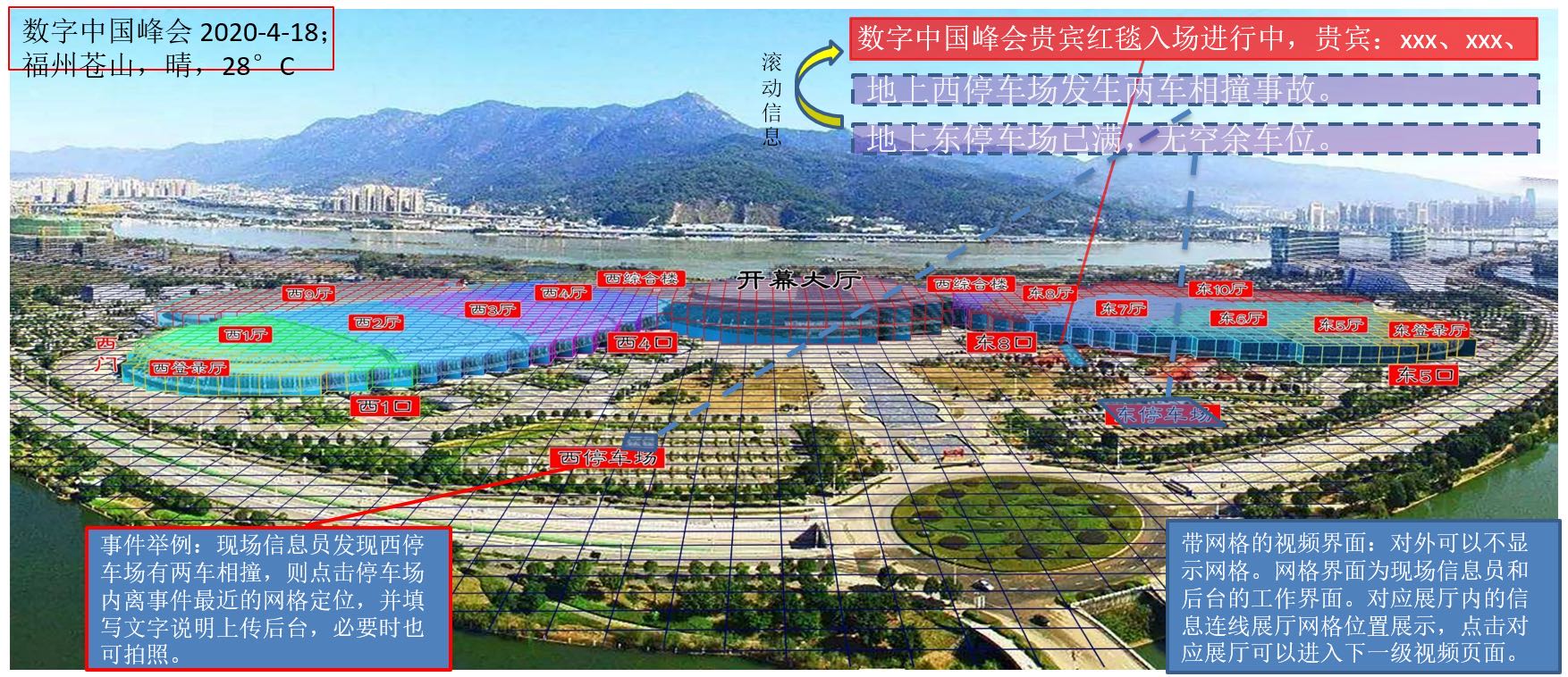 通過(guò)給福州倉(cāng)山海峽會(huì)展中心安裝多個(gè)高位攝像頭,利用北斗網(wǎng)格編碼和三維網(wǎng)格立體建模技術(shù),實(shí)現(xiàn)視頻內(nèi)容空間感知、快速定位、高效管理、多源數(shù)據(jù)協(xié)同分析能力的視頻網(wǎng)格化管理系統(tǒng),滿足跨鏡頭跟蹤、人群趨勢(shì)分析等應(yīng)用需求,從而快速、高效地實(shí)現(xiàn)會(huì)展中心視頻監(jiān)控智能管理、重點(diǎn)區(qū)域安全態(tài)勢(shì)感知及實(shí)時(shí)指揮,提升會(huì)展中心安防管控能力和應(yīng)急事件響應(yīng)能力。